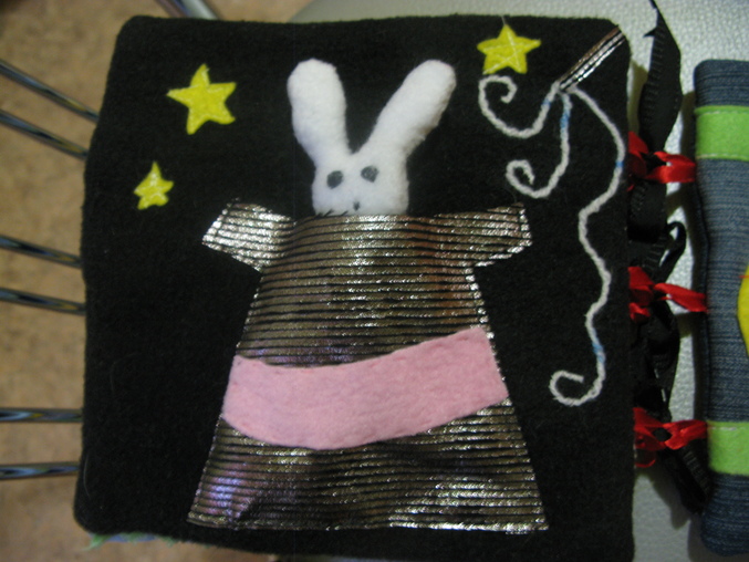 Последняя страничка Цирк. По мановению волшебной палочки со словами "абра-кадабра" из шляпы появляется зайка. Ребенку смешно. Зайку много-много раз прячет и достает из шляпы.