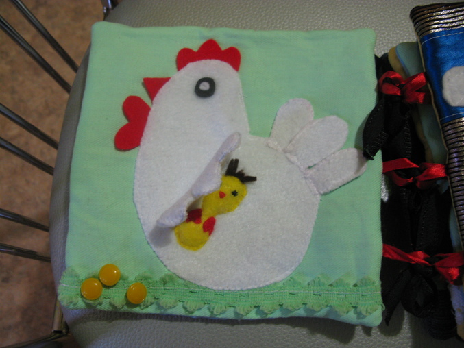 Следующая страничка курочка, под крылом которой прячется цыпленок, есть пуговки-зернышки, которые они дружно клюют, хвостик у курочки можно подергать.