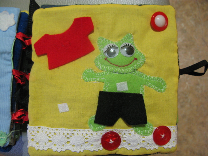 Следующая страничка с заданием - одень лягушонка. Шортики и маечка на липучке. Глазки приклеены намертво супер-клеем