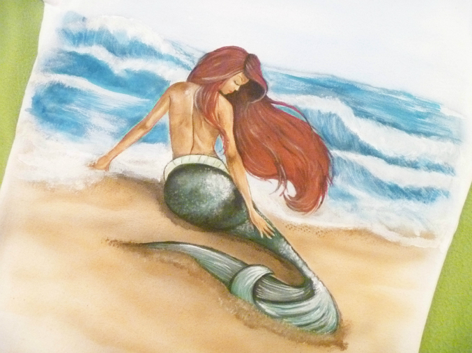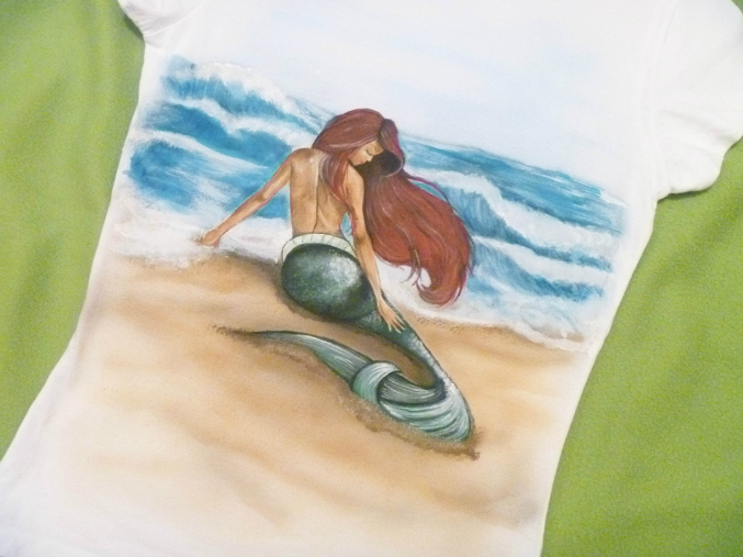Роспись по ткани, батикСмотрю на эту футболку, и прям заражает своим спокойствием...не смотря на бурные волны на заднем фоне. Кажется, закроешь глаза, и услышишь звук волн и почувствуешь запах моря!
