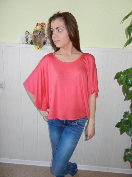 Шитье одежды, выкройки, ремонт одежды, шторы, швейные машины (уже приобретенные)Сшила для дочери такую вот разлетайку "а ля Пугачева". Ткань трикотаж, цвет коралл. Шьется очень просто. Два полукруга, на спине небольшой вырез.