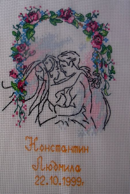 Оксана, оч красиво, и вы с вышивойкой мне прям удачно встретились))))) вышлите пож схему на почту sanita15@mail.ru она у меня на работе есть, но туда еще только после праздников. и еще хотела спросит: а что это за размыточти полукрестом на женихе и невесте, их вроде на схеме нет, или я невнимательно смотрела?