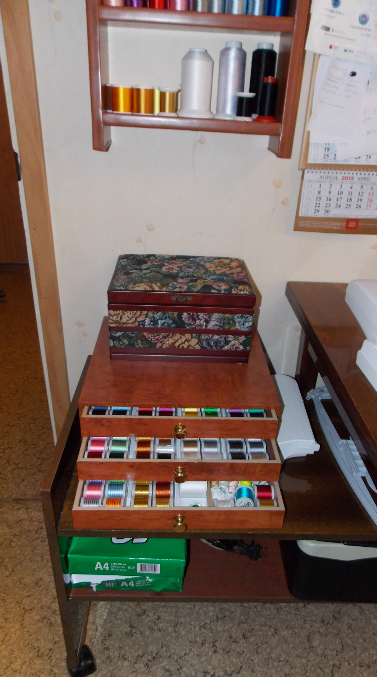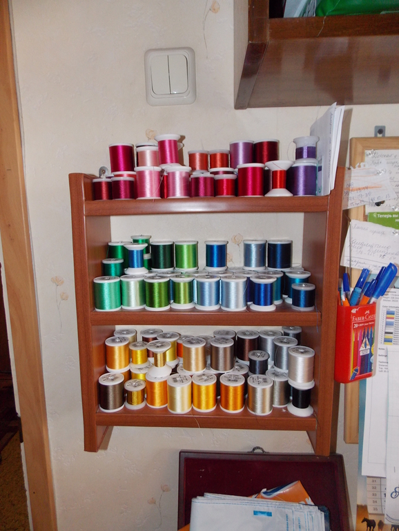 Я тоже думала о полке для вышивальных ниток. Хорошо когда их видно и выбирать легче. Но они там пылятся, и это меня останавливает, т.к. смахивать с них пыль проблематично. Поэтому хряню нитки в коробках.