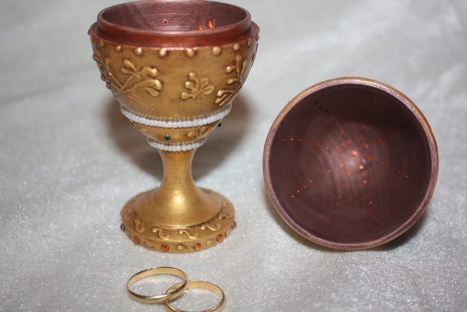 Использованы техника многослойного морения, техника имитация чеканки, старение, декорировано стразами Сваровски и бисером под жемчуг.