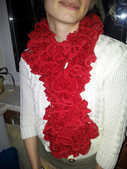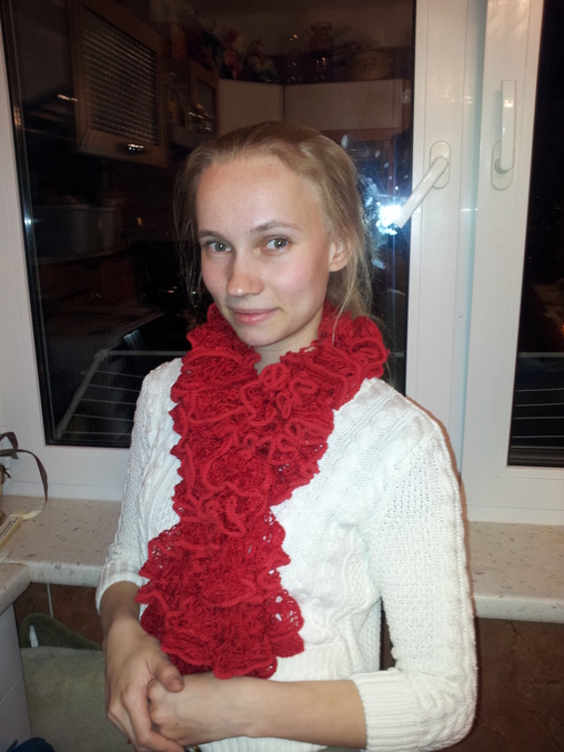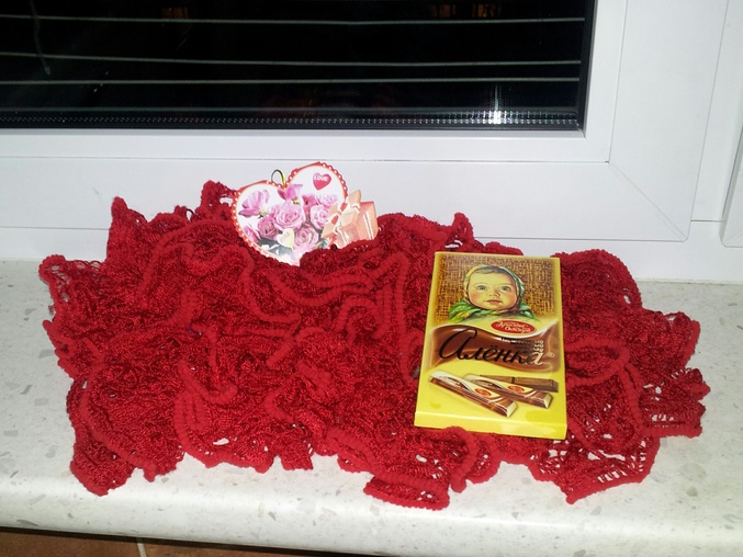 Так приятно, просто словами не передать!!! Вживую шарфик просто нереально красивый! Цвет такой яркий, насыщенный, весь он такой приятный-приятный, воздушный, легкий, глаз не отрвать. Муж тоже впечатлился, кучу комплиментов услышала в адрес шарфика, рукодельницы, которая его связала, и счастливой обладательницы, то бишь меня=)