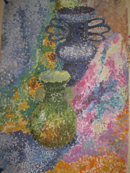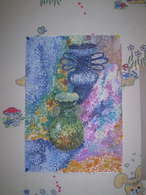Живопись, точечная росписьЗимой как-то показывала работы старшей дочери, которая через месяц заканчивает художественную школу... Работы показала выборочно, только те, что дошли до нас, остальные остаются в школе.