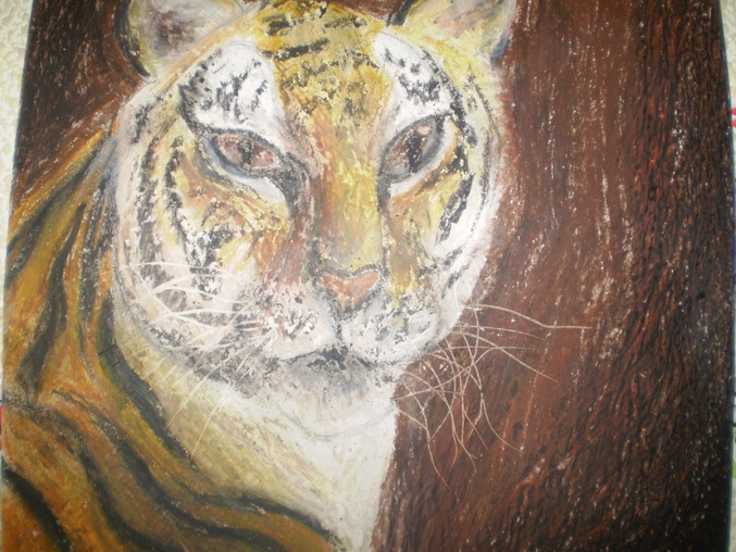 А сегодня случайно откопала еще две её работы. Вазы рисовались года два назад, это была первая работа, выполненная в такой технике. Ну а свирепый тигр (как она его назвала тогда), рисовался восковыми мелками очень давно, кажется классе в первом художки.