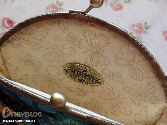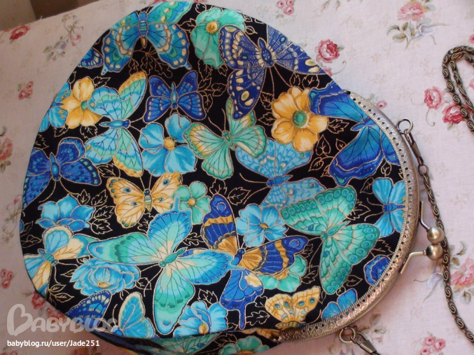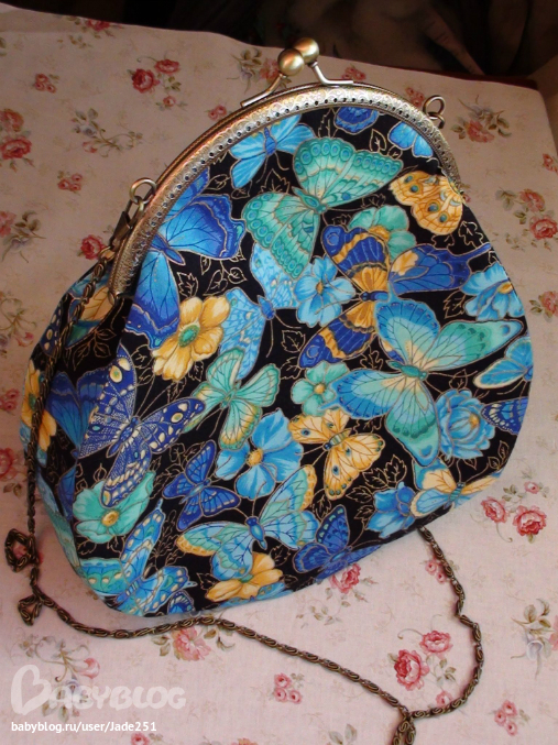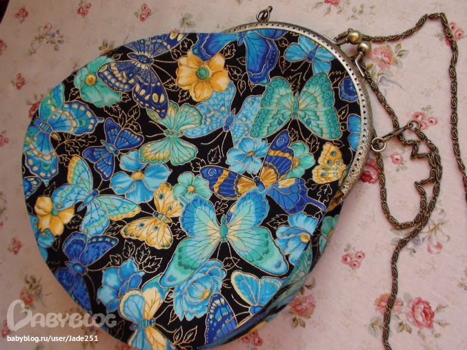 Выполненна из американского хлопка,у рисунка золотой контур,бабочки на подкладе тоже золотым "нарисованны". Размер в 25*ш 21* гл 7см,фермуар 15 см,цепочка 120 см.