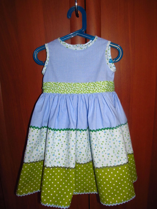 Шитье одежды, выкройки, ремонт одежды, шторы, швейные машины (уже приобретенные)Перебирала свои запасики, и как-то сложились у меня отрезки в зелено-голубых летних тонах. Самый большой был 50 см. Решила доченьке платье на лето придумать, по деревне гонять. И вот что получилось. Строго не судите, это второе сшитое платьице.