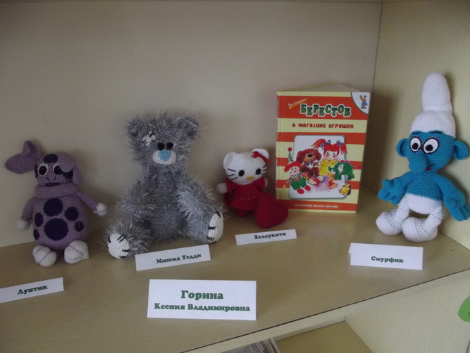 Очень мишка понравился, связанный из "травки", лопоухий Лунтик.... Книги обязательно, это ж библиотека!