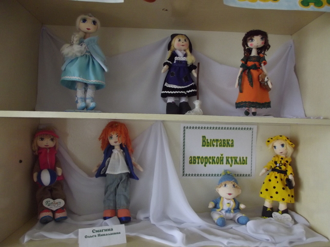 Вот и вся выставка! Стеллаж посерединке с моими куклами. Расставляли и делали все работники библиотеки, может ещё что-то изменят и поменяют. А может найдутся ещё рукодельницы, которые принесут свои работы. Изначально планировали только кукол, а позже появились и медвежонок с Лунтиком....