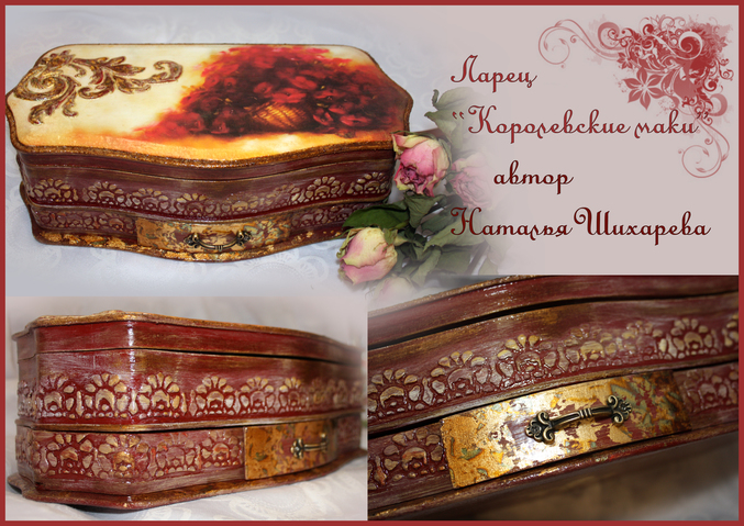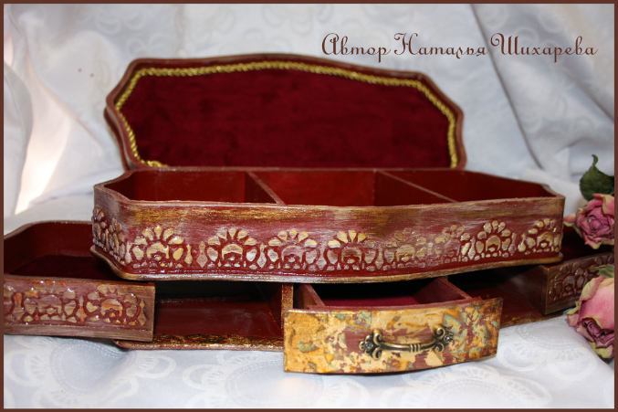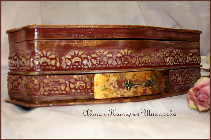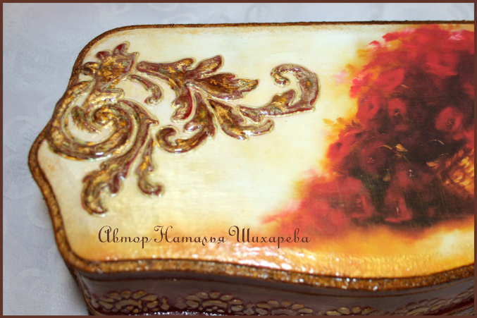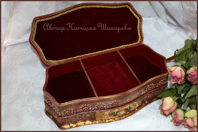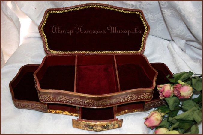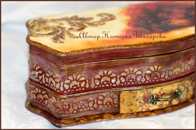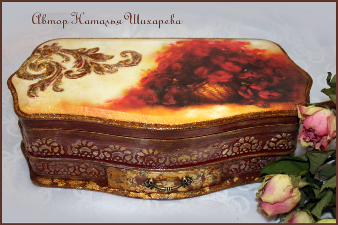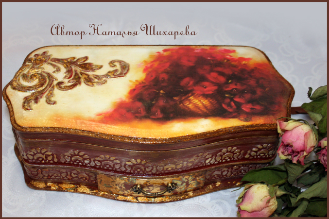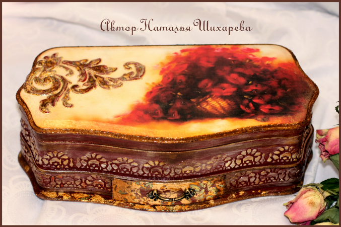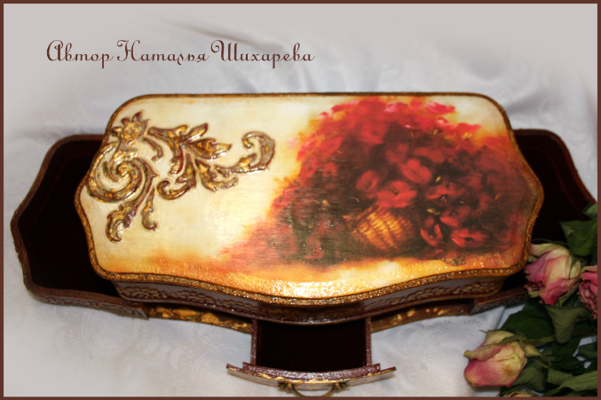 ДекупажДелала в качестве подарка на день рождения для подруги. Подруга попросила в подарок шкатулку, говорит "в красном кубе продаются всякие, мне украшения некуда складывать", девочки, ну был бы стыд и позор, если бы ей "китай" из красного куба купила))) Посему быстро за 4 дня и 4 ночи, не спамши-не емши была создана шкатуль, если честно, то празднование ДР было на 18-00 назначено, а я без 15 пять еще бархатом все оформляла...и встала в выходной день в 9 утра, уснув в 4, для меня это подвиг:))) хотела успеть и успела!