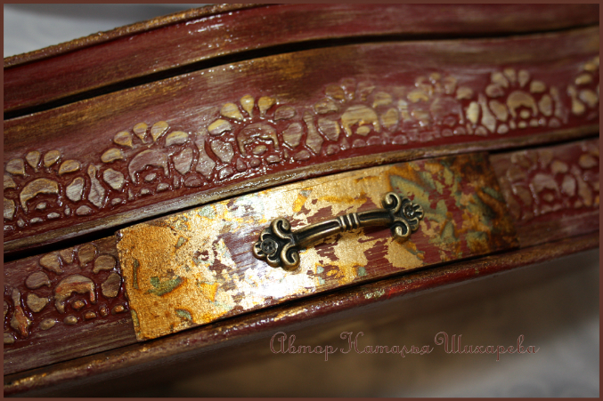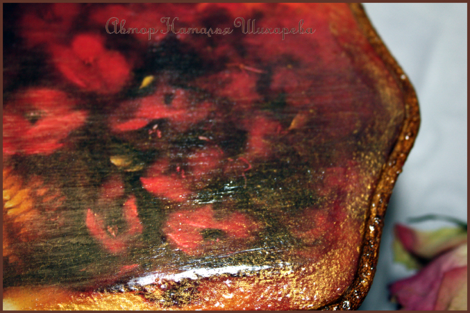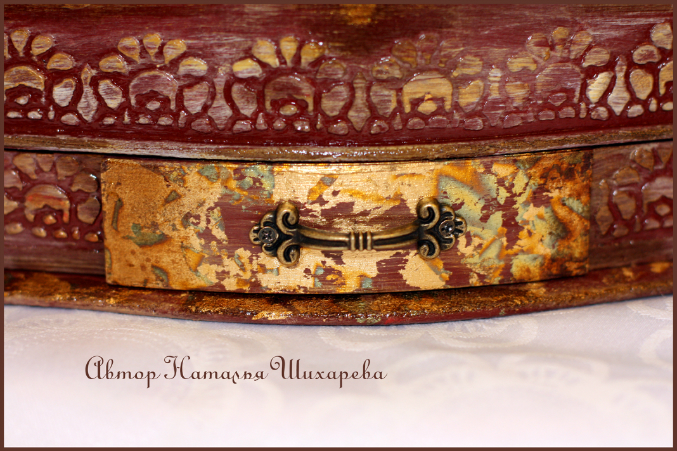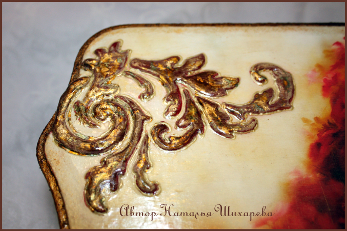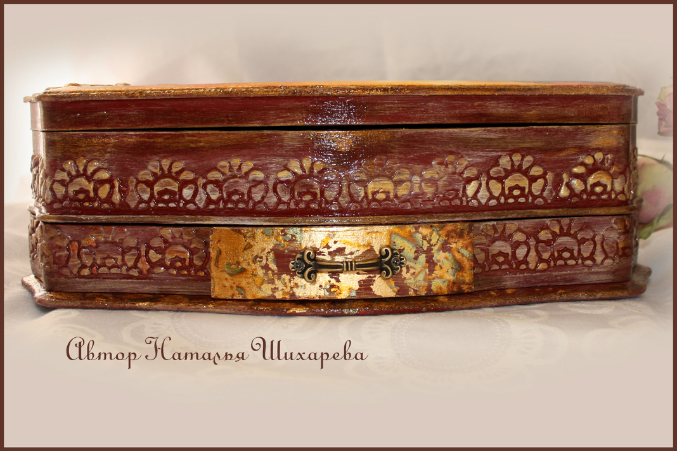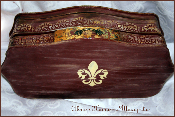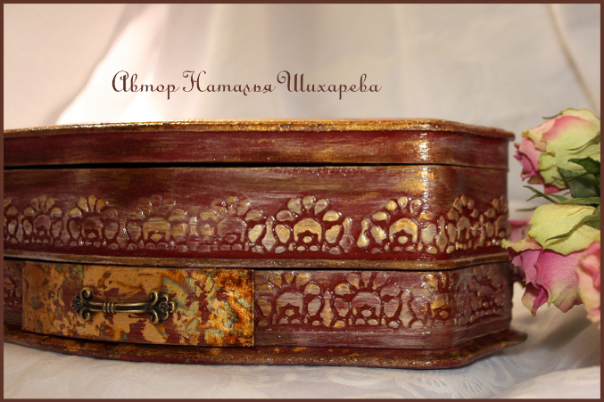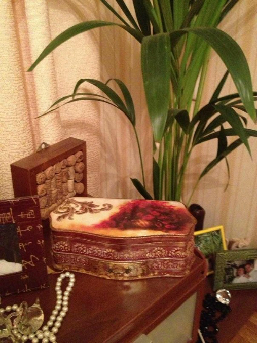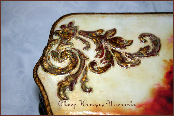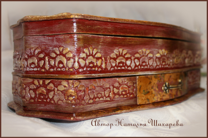 ДекупажДелала в качестве подарка на день рождения для подруги. Подруга попросила в подарок шкатулку, говорит "в красном кубе продаются всякие, мне украшения некуда складывать", девочки, ну был бы стыд и позор, если бы ей "китай" из красного куба купила))) Посему быстро за 4 дня и 4 ночи, не спамши-не емши была создана шкатуль, если честно, то празднование ДР было на 18-00 назначено, а я без 15 пять еще бархатом все оформляла...и встала в выходной день в 9 утра, уснув в 4, для меня это подвиг:))) хотела успеть и успела!