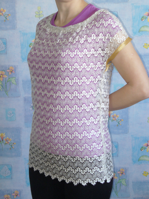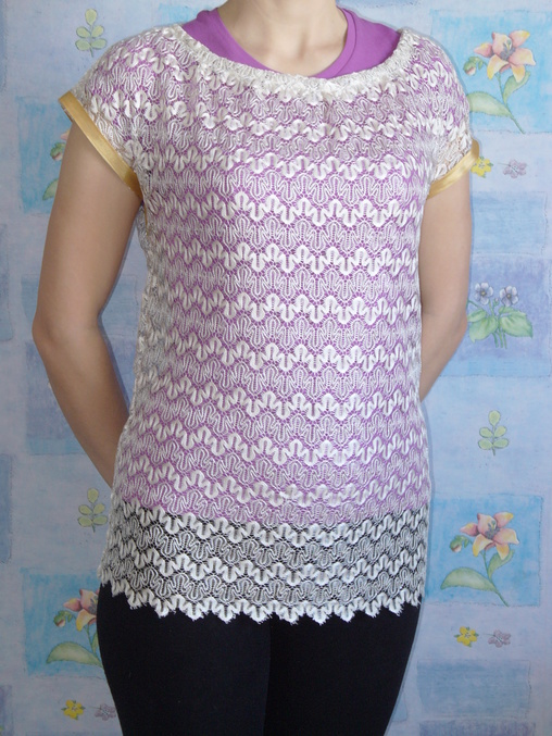 Надела с майкой чтоб лучше было видно рисунок, но можно и с купальником на пляж... Выкройка из Бурды, но там только спинка из кружева, а я эксперементировала.Не судите строго.Спасибо за внимание.