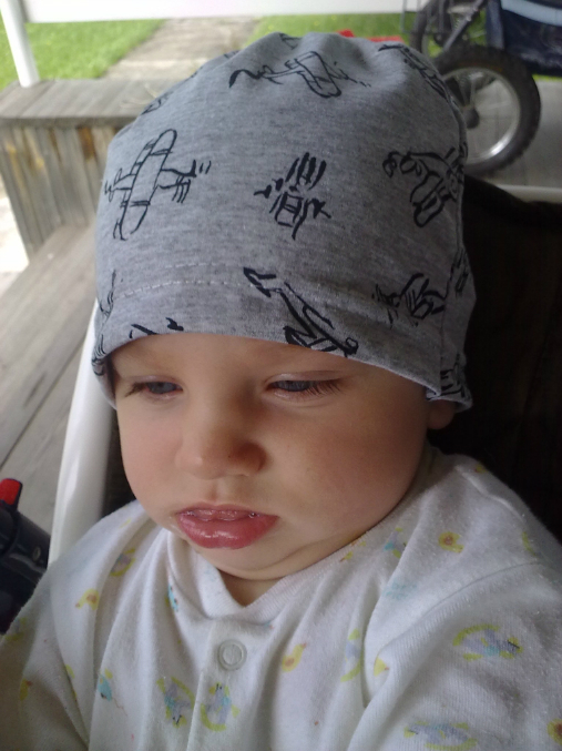 приехали мы как то на дачу, погода ветренная, а в нашей привезенной шапочке жарко, вот быстренько сварганила из маечки, которая давно лежала, какой то умный человек шьет так майки, что дети не влезают в нее, майка размером 2 года, а мой 6 мес пупс не влез в нее, вот я и решилась на переделку. начала с того, что одела маечку на голову, отметила где надо обрезать, разрез получается на одинаковом расстоянии от бокового шва на переде и спинке майки. получился прямоугольник с разрезиком сбоку. отступив около 10см на глазок вырезала округлость, чтобы было симметрично, сложила шапочку пополам, затем, по изнанке сшила округлость и шовчик боковой, получилась милая шапуля. на фото в белом комбезике нам 6 мес, на фото в ветровке мы сейчас =)