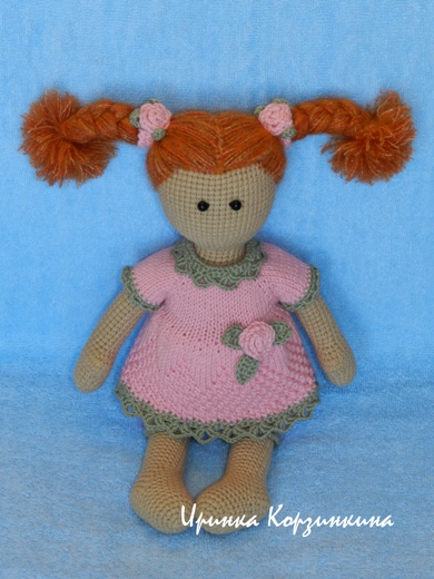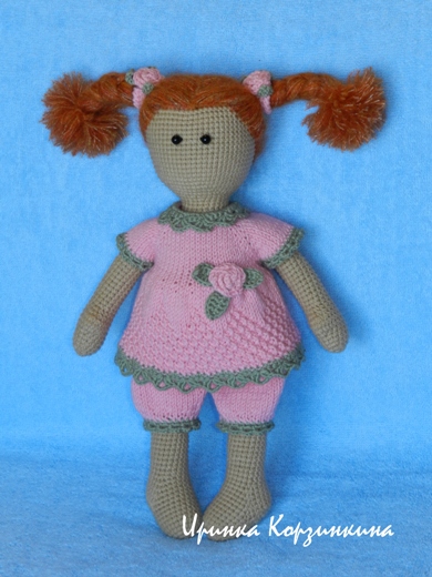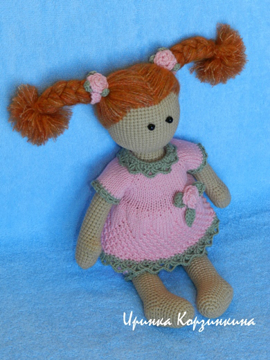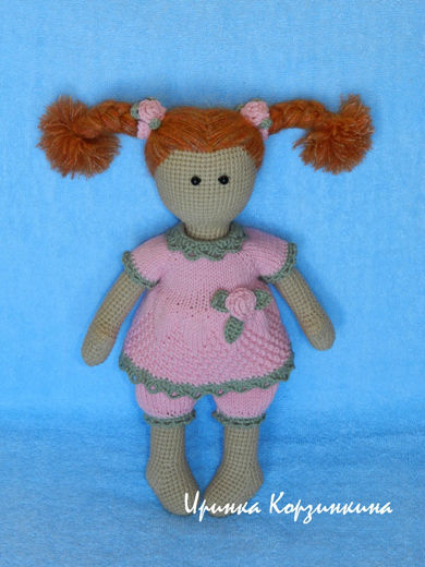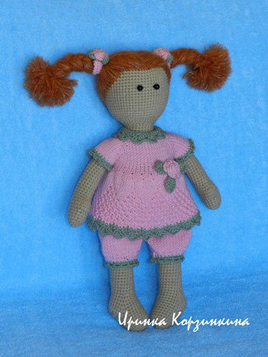 Кукла цельновязаная. Выполнена крючком из хлопка с акрилом. Руки-ноги подвижные. Стоит, сидит с опорой. Одежда связана спицами, не снимается. Волосы наборные. Мохер.
