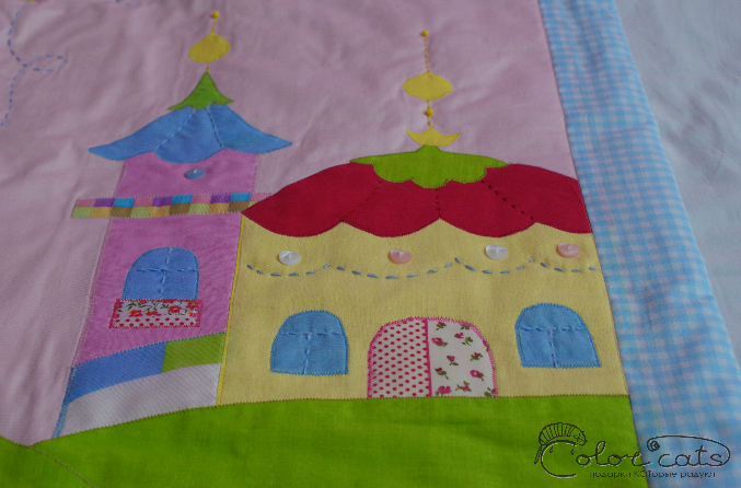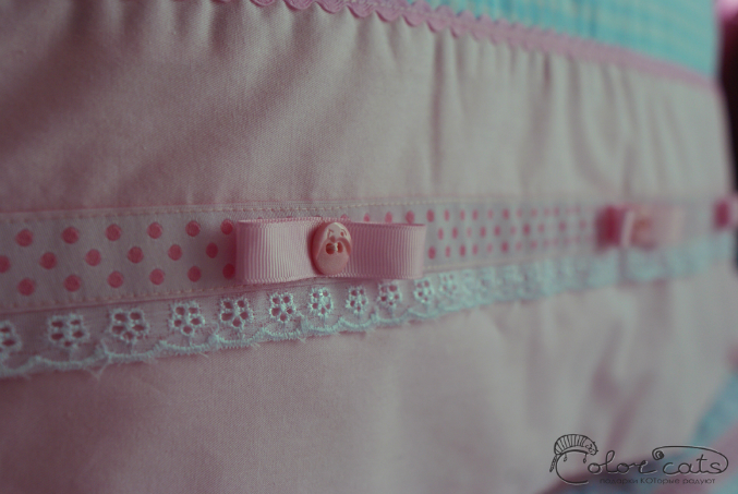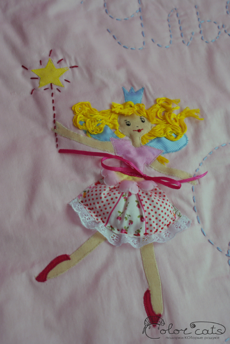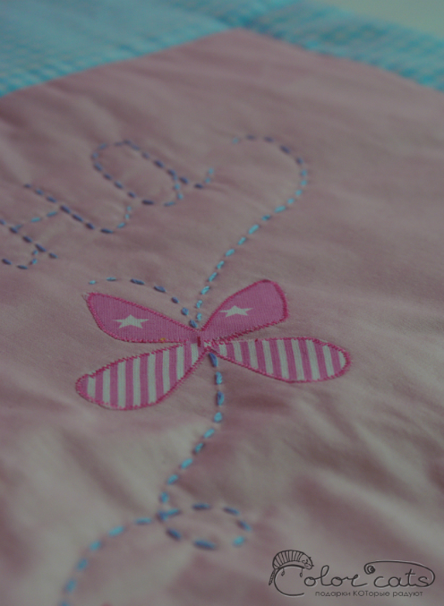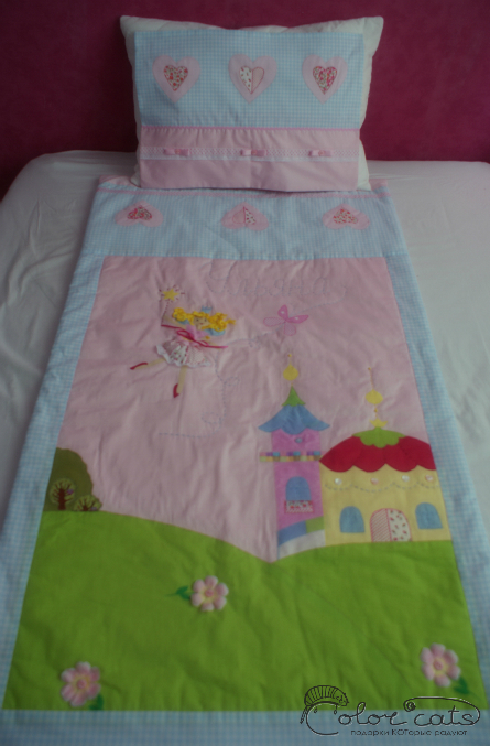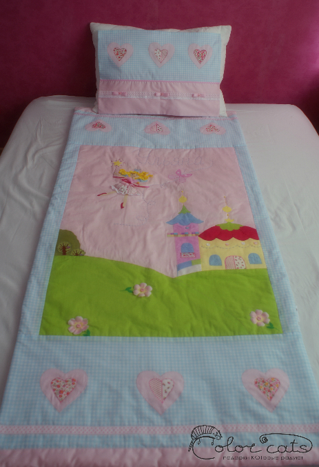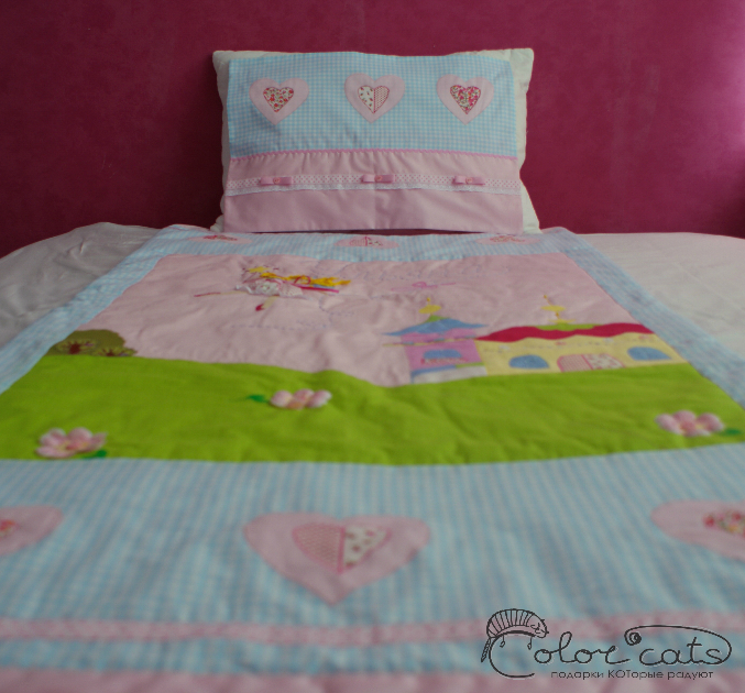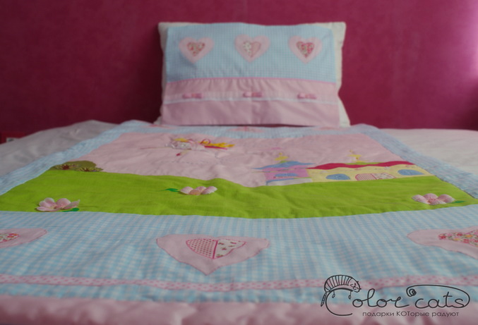 Всем привет) Хочу показать вам комплект для юной принцесски Ульяночки, любительницы мультика про принцессу Lillifee. Одеялко 80*165 и наволочка на подушку 40*60 в нежных розово-голубых тонах. Внутри одеялка - синтепончик, наволочка на подушку сзади застегивается на молнию.