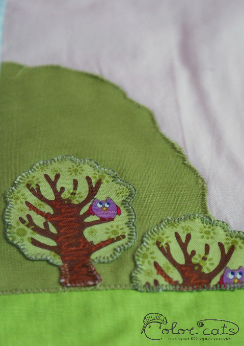Насть, крупные элементы я пристрачиваю мелким зигзагом на машинке, а мелкие детальки - вручную (посмотри, как деревья с совами, например).