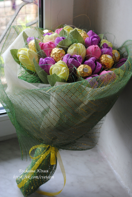 Есть сегодня здесь кто? Ау. Девочки оцените,плиз, букет для большой начальницы, заказчица сама выбирала какой букет и какие цвета, так что идея не моя. Нужен взгляд со стороны. Правда фотик цвета немного соврал, грязноваты оттенки кое-где.