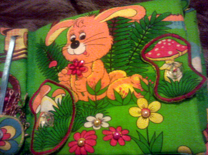 Цветок у зайца- пришит цветок (бусина)/, серединки цветочков-бусинки. Грибы отстегиваются.