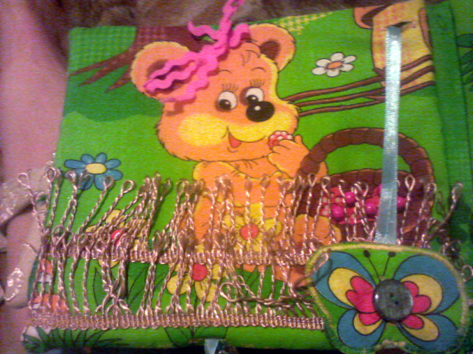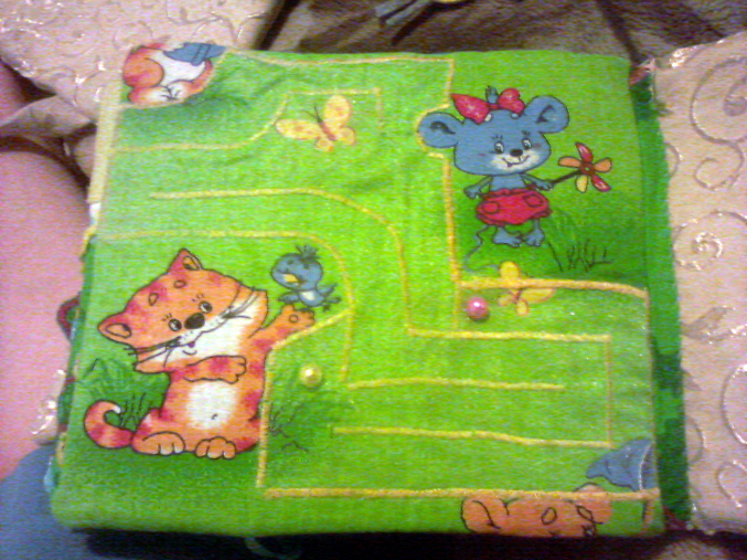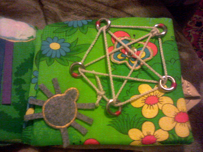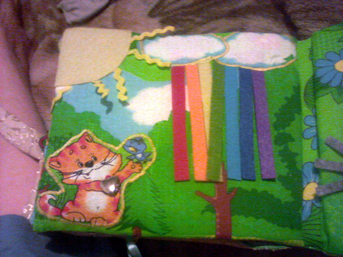 Здесь изучаем цвета. Лучики можно дергать, так же как и саму радугу. У кота пришито сердечко.