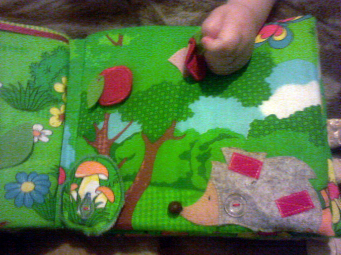 Яблоки на липучках, грибы на пкговице, их тоже можно прилепить на ежика. (сынок яблоки отрывает, активно учавствует в процессе