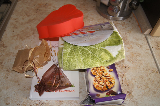 Ну вот ,собственно , и подарок-сюрприз !!! в бумажной упаковке крошечные высохшие кусочки мыла,поврежденная коробка печенья (слюда тоже повреждена),печенько пропахло этим мылом,так что есть его совсем не хочется... В бордовом мешочке поврежденный кулончик... книжка ...тряпка хозяйственная... ну и силиконовая форма для кексов(за нее спасибо )