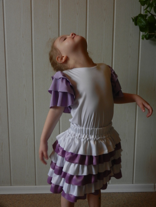 Ну а это я для своей Лизочки шила футболочку с тройными крылышками (рукавчики сшиты из масла). В нашем гардиробе тоже имеется сиреневая юбочка (только однотонная), поэтому сиреневые рукава - это наша тема. Правда футболочка нам немного большевата оказалась.