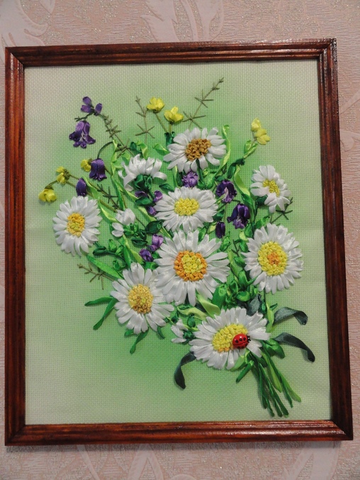 У нас почему-то в багетной мастерской не делают рамку для таких работ. Сказали изнанка должна быть идеально ровной, а там сами понимаете, ленты, узелки. Вот пока такую одела.