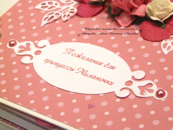 Книга пожелания, как обычно формата А5, жесткая обложка , отдекорированная скрап-бумагой и декоративными элементами, на завязках, 20 листов для пожеланий, 6 мест для фото 10*15 с подписями