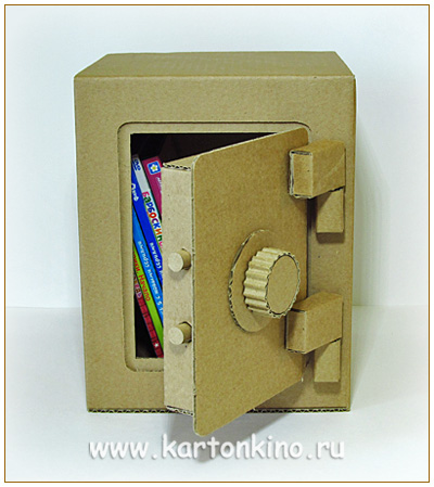 А это еще одна игрушка из картона, которую мы сделали чуть раньше, - сейф с механическим замком.