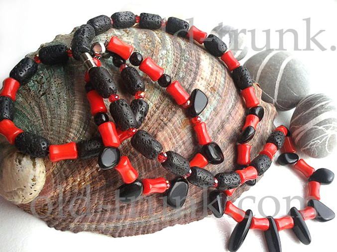 Комплект с лавой и кораллом и чёрным агатом. Островитянка.