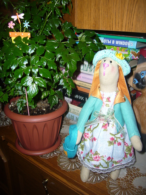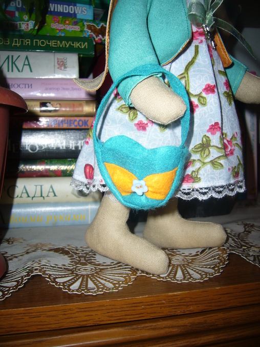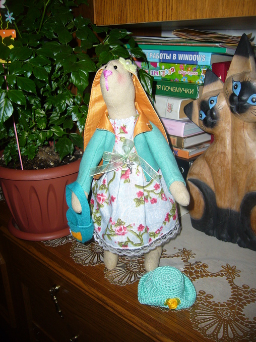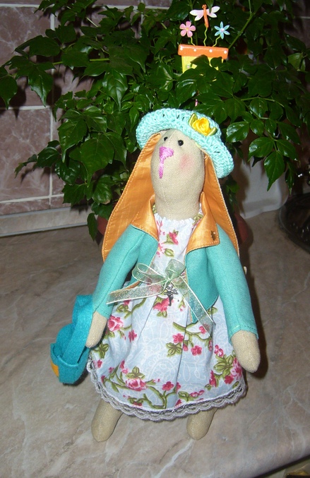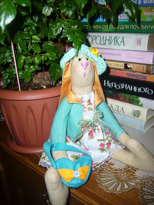 Сшила для еще одного обменчика с девушкой Кристиной вот такую заю.Пожелания были чтобы зая была девочкой в желто- зеленых тонах и в шляпке.От себя решила добавить еще сумочку.Вот такая модница получилась.Лишь бы Кристине понравилась...Мне самой очень даже ничего кажется))).