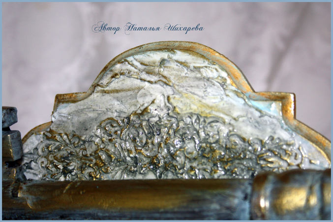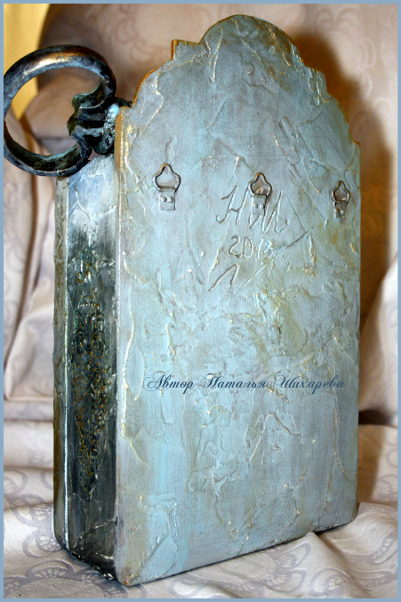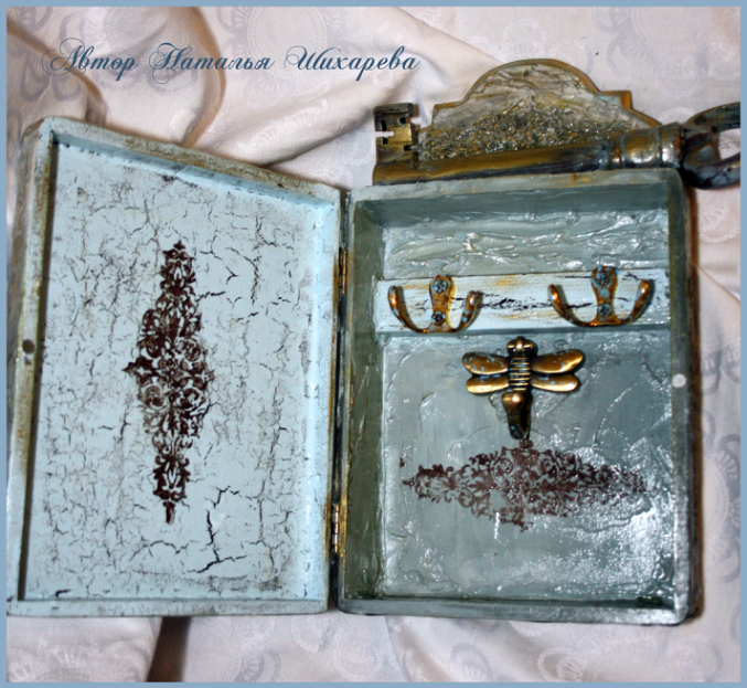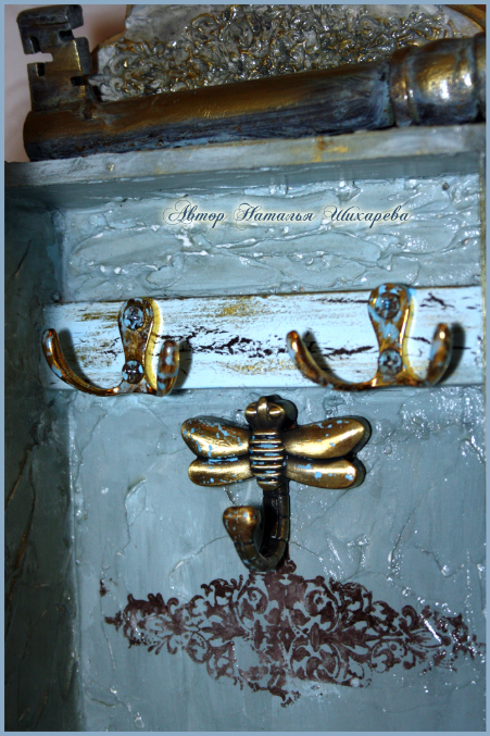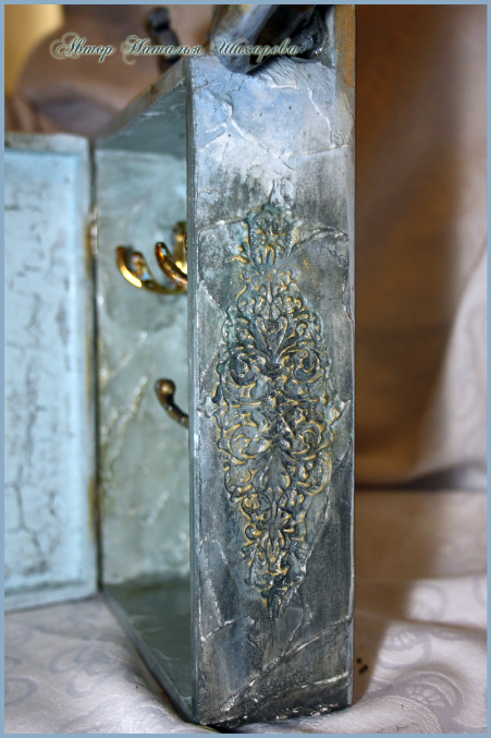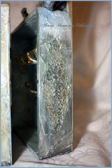 спасибо, Ленусь! У тебя такое впечатление, потому что ключ проерашен краской того тона, что на ключнице основной, а потом ключ еше позолочен тем же золотом, что и на общих плане ключницы, поэтому все перекликается и кажется, что тоже металл) там мдф)