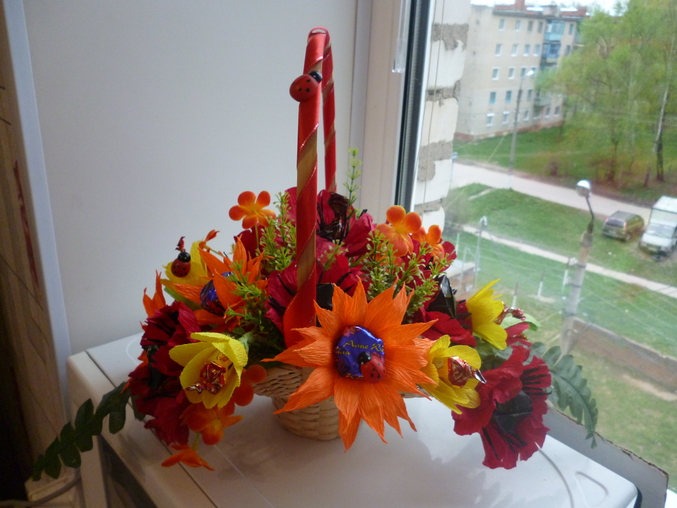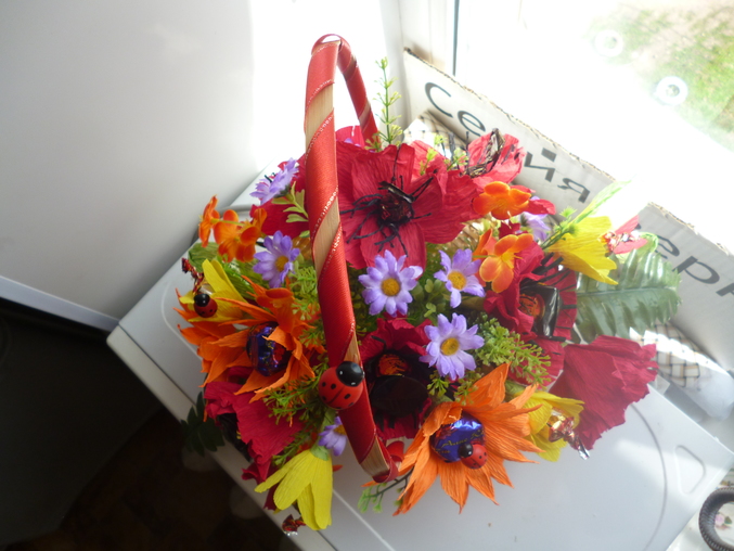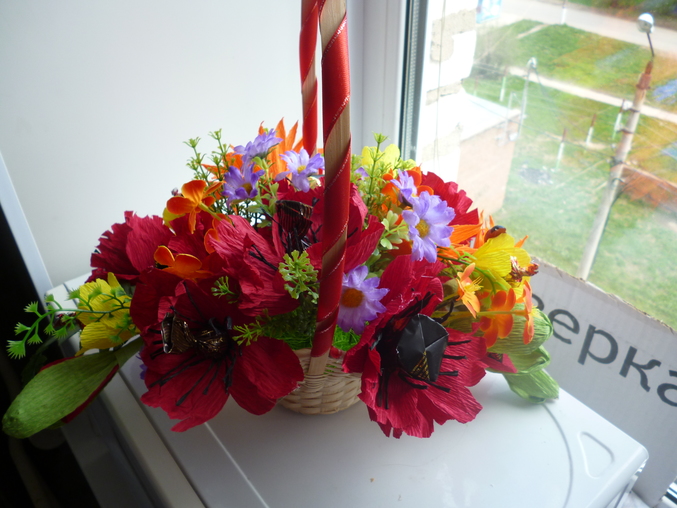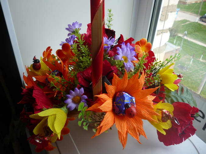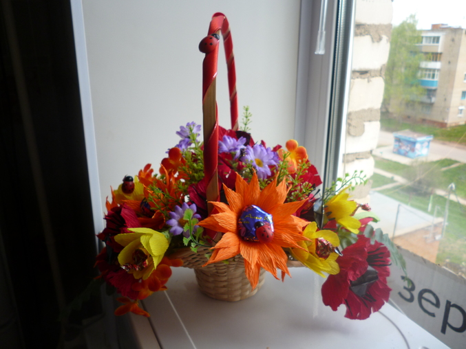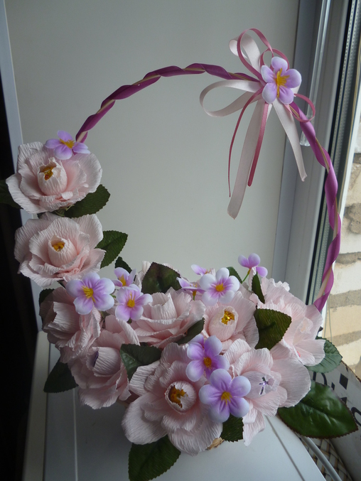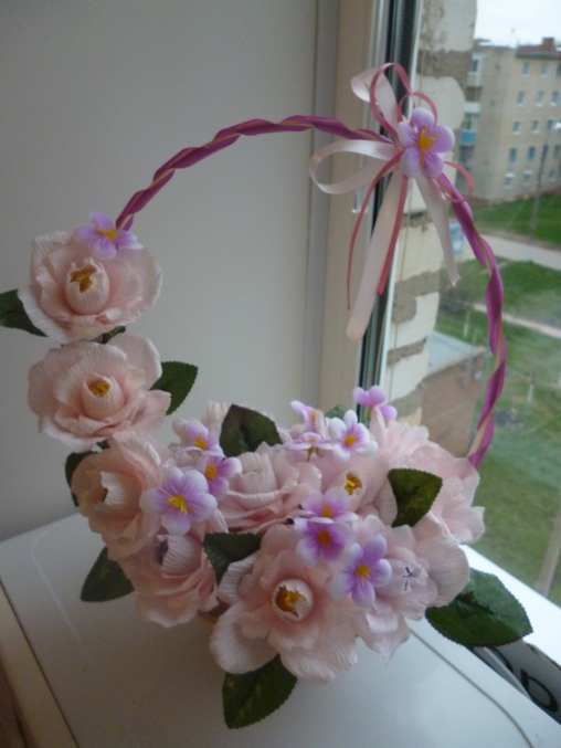Скажу своё мнение:неочень маленькие цветочки нравятся,не пойму к месту ли они вообще?и ленточка на корзинке хотела под цвет маленьких цветочков,а на деле более яркая получилась. Что скажите вы?