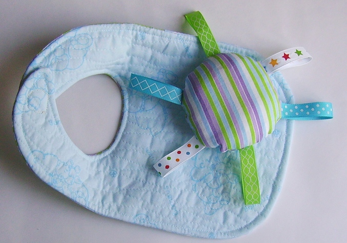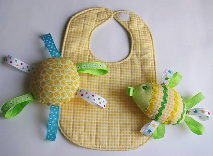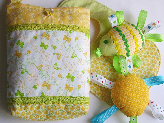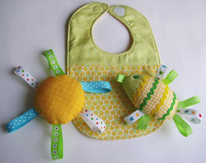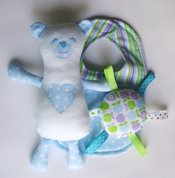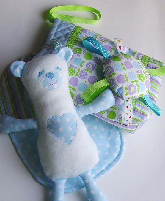 сумочка для памперсов (вмещает 2 памперса, одноразовую пеленку и маленькую упаковку салфеток) - удобно взять с собой в гости или поликлинику, нагрудник и парочка игрушек, "солнышки" и рыбка-погремушки, а мишка просто игрушка.