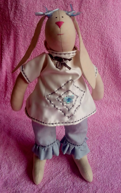 Тельце сшила быстро, а вот с нарядами я обычно торможу. Ну вот дошилась. Хотя в процессе фотографирования поняла что зайка то у меня, без белья. Буду дошивать. В ножках проволока, зая стоит и сидит. Одежда снимается.