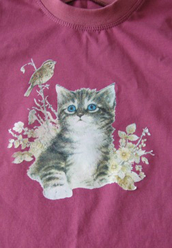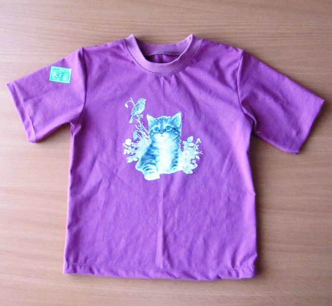 Этот отрез кулирки хб с лайкрой тоже "резиновый" оказался. Я и себе майку сшила, легинсы старшей, майку вот с котёнком и из остатков еще майка одна младшей на вырост