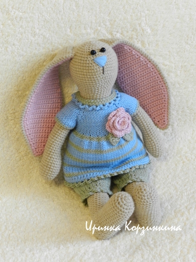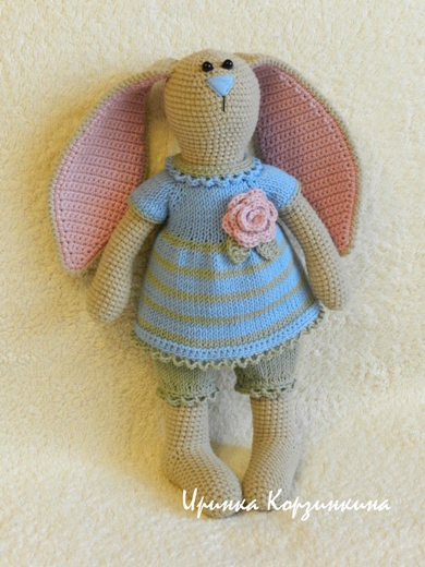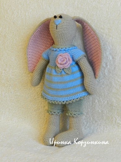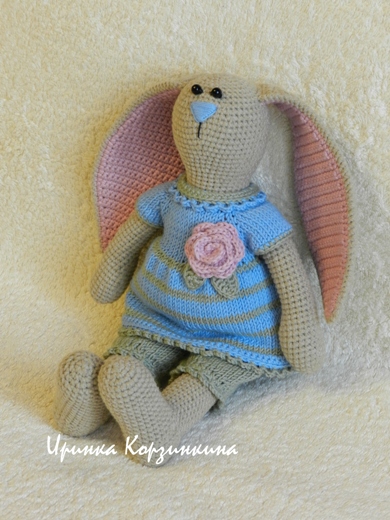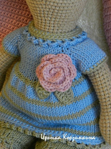Зайка цельновязаная. Выполнена крючком из хлопка с акрилом. Внутренняя часть ушек и роза связаны из хлопка с шелком. Лапы подвижные. Зайка сидит и стоит с опорой. Предпочитает мягкую подушечку))). Наряд связан спицами из хлопка с акрилом, не снимается. Наполнитель - синтепух. Размер игрушки 28 см.
