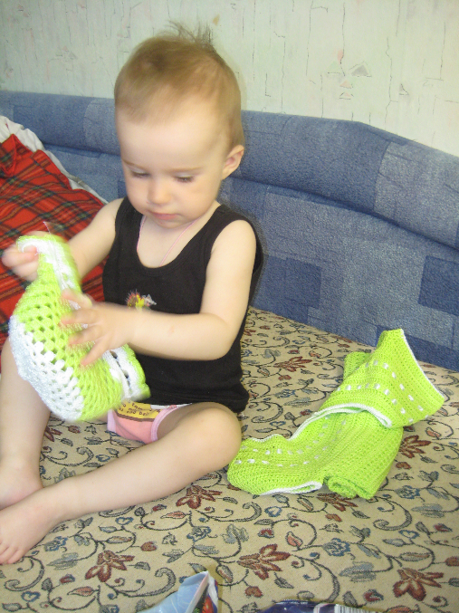 Вот собственно предмет обмена- шапочка просто чудесная, кофточка тоже, там сзади еще пуговки. Футболочка как раз на лето, сейчас чуть свободная. Свекровь вообще в восторге ))