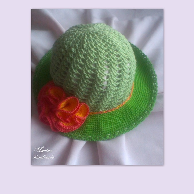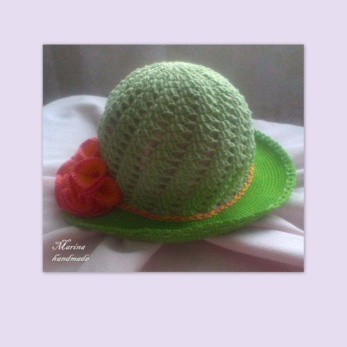 Вязала шляпку для девочки с рыжими волосами и цветовой подбор старалась максимально сохранить как в оригинале у Гали, мне кажется будет Очень красиво сочетаться с рыженькими!!! Обещали потом показать фотоотчёт. Ниточки брала салатовый и зелёный - Lira от VITA 50/150 (немного близко по метражу), жёлтый - Саммер от Ярн Арт, а оранжевые не помню названия, что-то вроде Снежинки, тоненькие (в две нити).