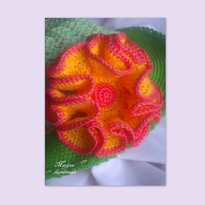 Цветочек оставила без изменений, хотя неплохо было бы добавить под сердцевину (обвязанная пуговица) оранжевые тычинки из петель (цепочки из в. п.) по кругу. Переделывать не стала.