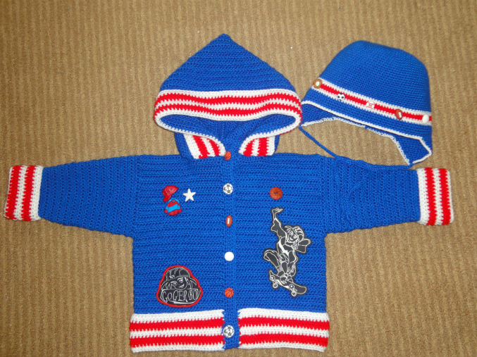 вязала без схемок-просто измерила своего малыша,а узор-полустолбик с накидом)))Курточка и шапочка -ниточки Нако беби бамбино,крючок 3.расход на возраст 1 год примерно 270 гр.Вяжется одним полотном,снизу вверх- плотным столбиком(полустолбик с накидом),далее рукава от пройм по кругу обратными рядами и капюшон ввязываем в горловину последним рядом.Шапочка по спирали связана столбиками без накида.Декор на ваше усмотрение)))капюшон вяжется отдельно прямоугольником-нужной длины и ширины,затем длину складываем пополам и по длине-сшиваем или связываем 1 край,получается капюшон,и его низ так же пришиваем или привязываем к горловине )))надеюсь понятно объяснила?если что-напишите)))Ровных и легких петелек)))