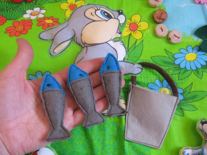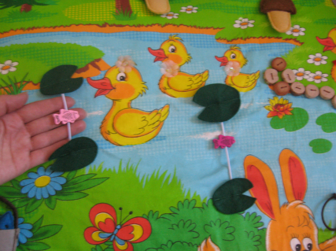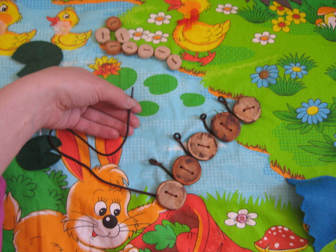 рыбки(деревянные бусины) на резинке, передвигаются вверх-вниз, прячутся под листик, камешки на берегу - деревянные пуговицы