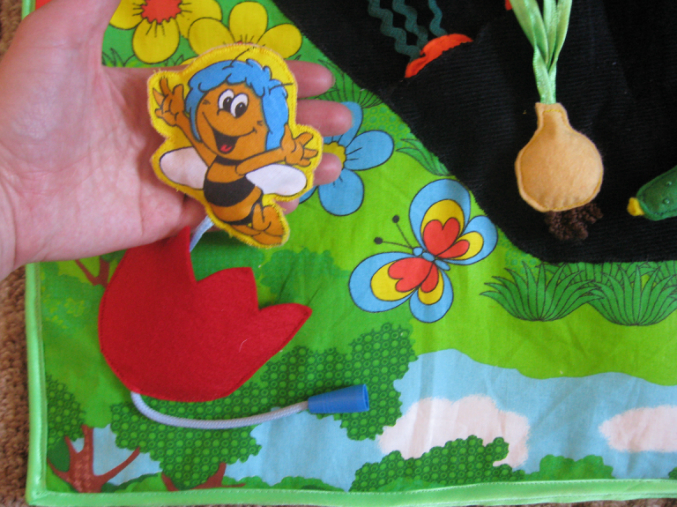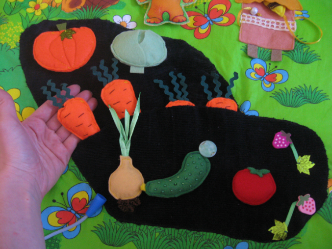Морковь растет в кармашках, огурец на пуговице, помидор на кнопке, остальные овощи на липучках.Ягодки - деревянные бусины.