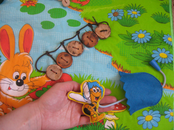 Пчелка вылетает из цветка, и прячется в него, если потянуть за веревочку)))