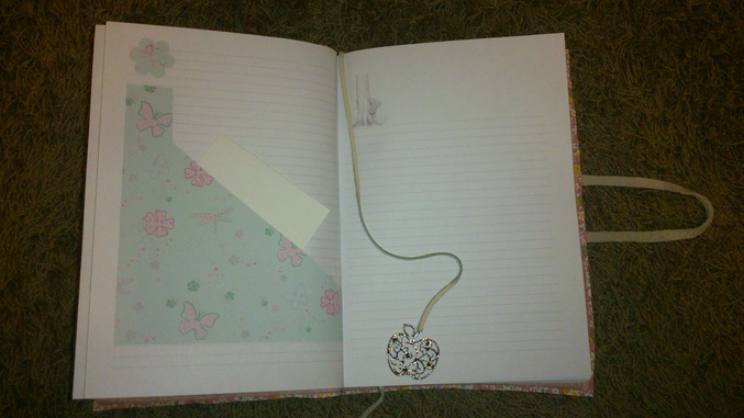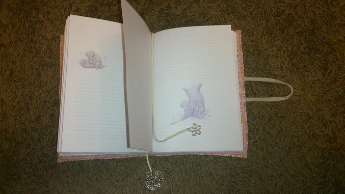 148 листов - 296 страниц в линейку, 31 картинка с мишками Тедди разных размеров. Имеется 2 закладки (яблоко и цветок) и 2 кармашка для записок. Обложка из бежевой натуральной кожи с тканевой цветочной подкладкой. Блокнот закрывается на пуговицу и петлю. Обложка с элементами декупажа.