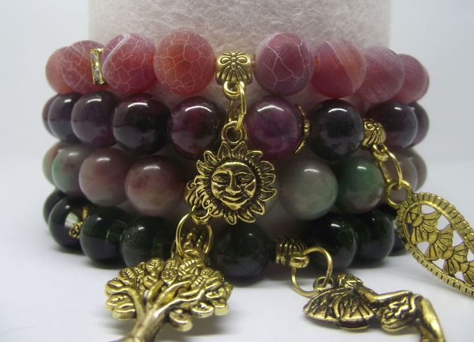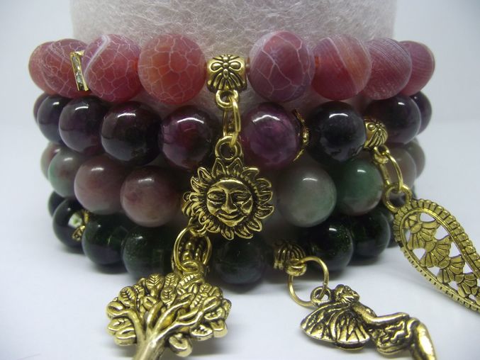 У меня этот комплект ассоциируется с гроздью винограда,где-то матовый,где-то глянцевый,словно гроздь красного винограда с листьями ))