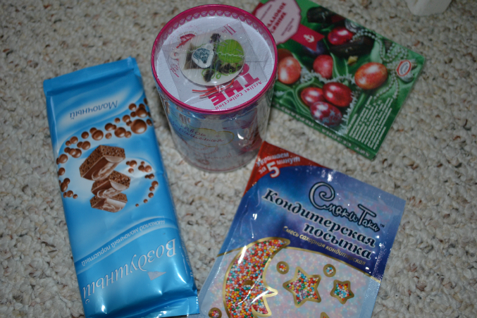 Вот сладости и мармелад-копилка , краска для яичек и посыпка для куличика....