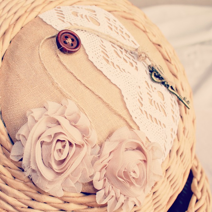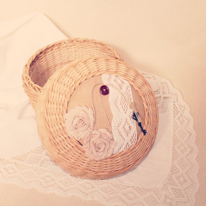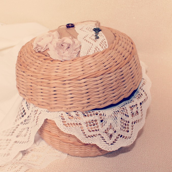 Итак, что у нас здесь... ВМ "Мокко", газетная бумага, акриловый лак. Подушечка на крышке мягкая, тонированый лен, шпагат, цветочки, ключик, кружево... Вот такой пейзаж...